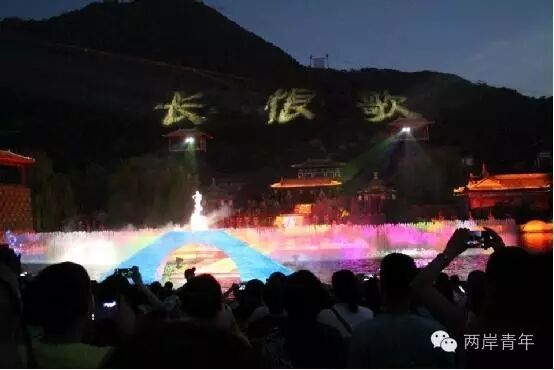 | 圖八、日已暮,長恨歌舞台劇剛開演,「長恨歌」三字突然投影在背後的山頭上,觀眾為之驚艷 |